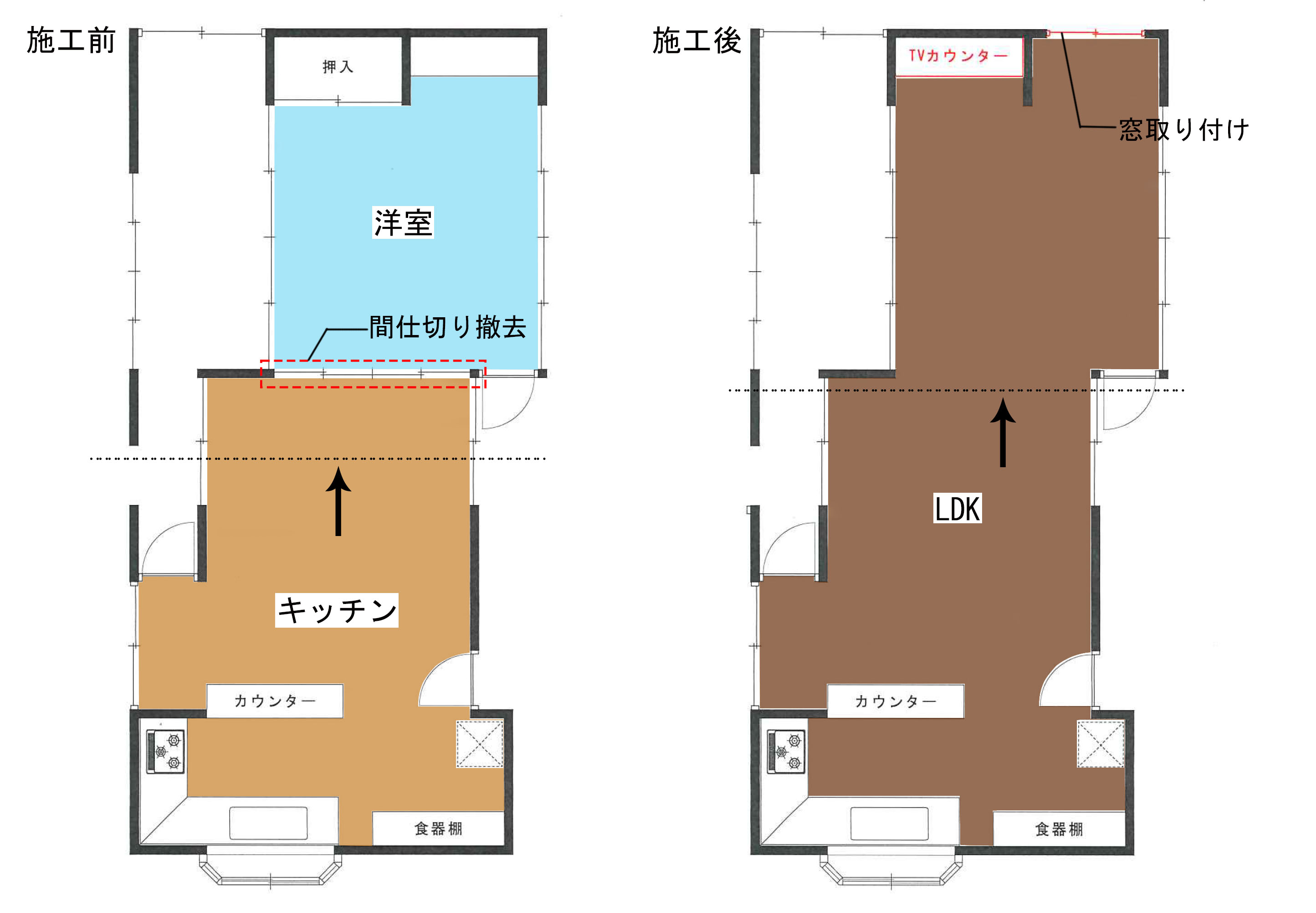 間仕切りをなくし、1部屋の広いLDKに改修を計画されました。