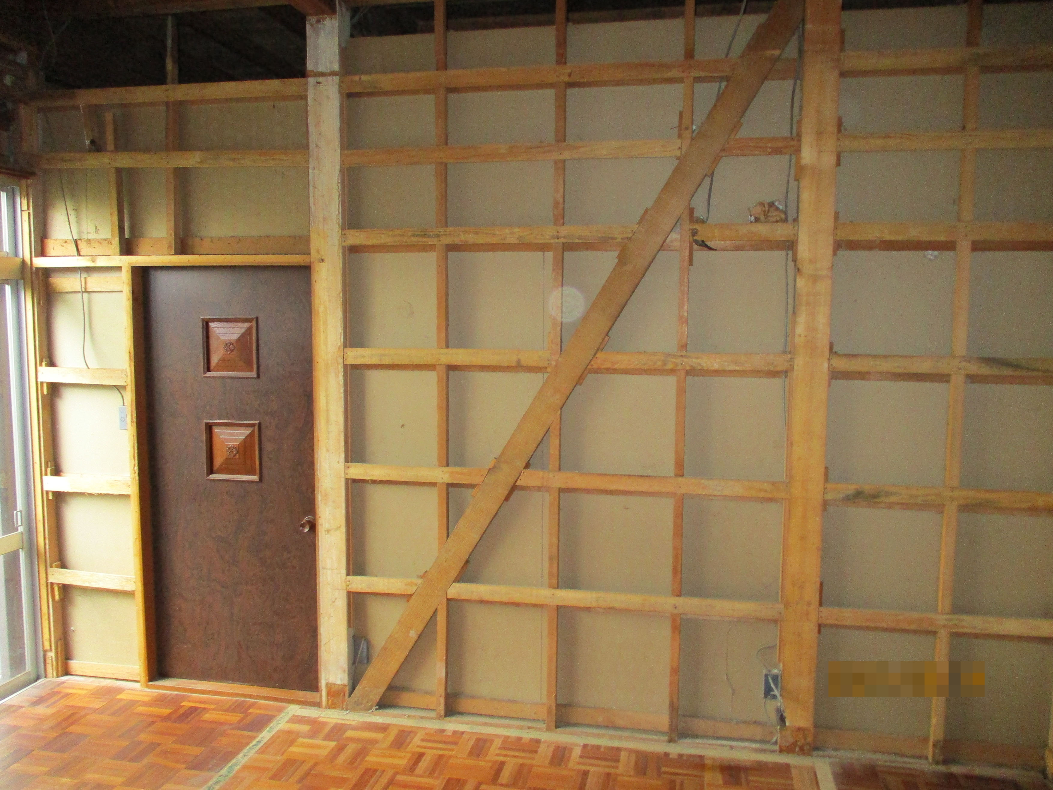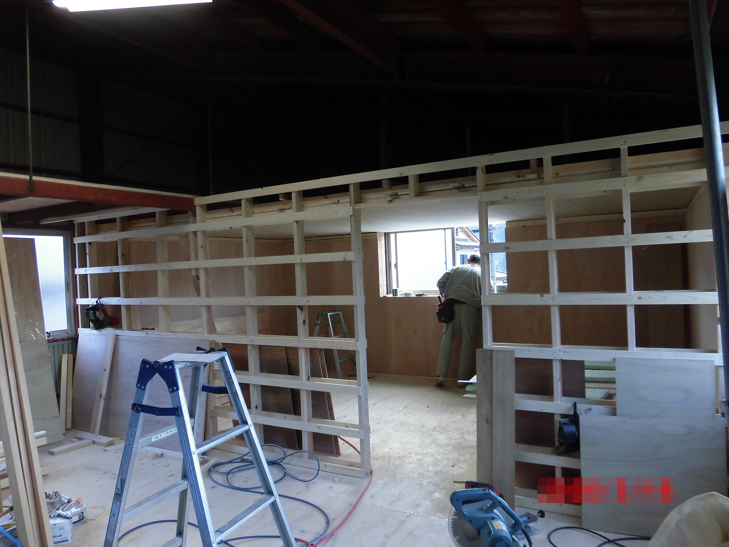 間仕切壁を造る部分に、木の枠を組み立てました。
