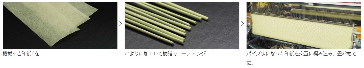 樹脂でコーティングして交互に編み込んで畳おもてにしています。