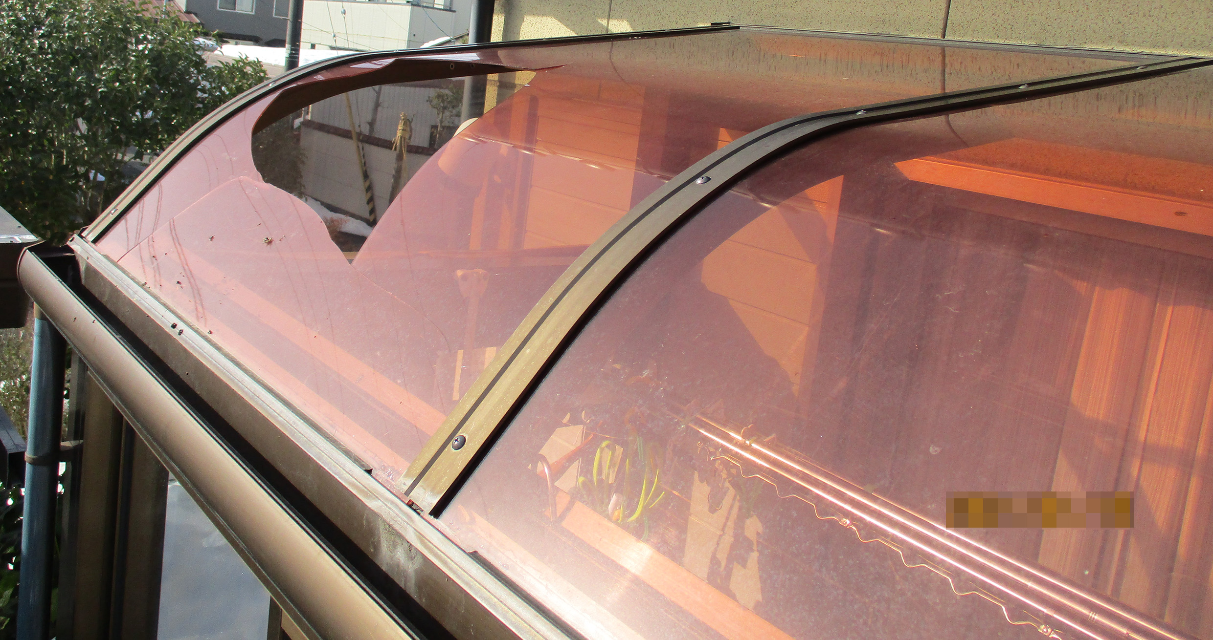 屋根からの落雪により、テラス屋根に穴が空いておりました。
