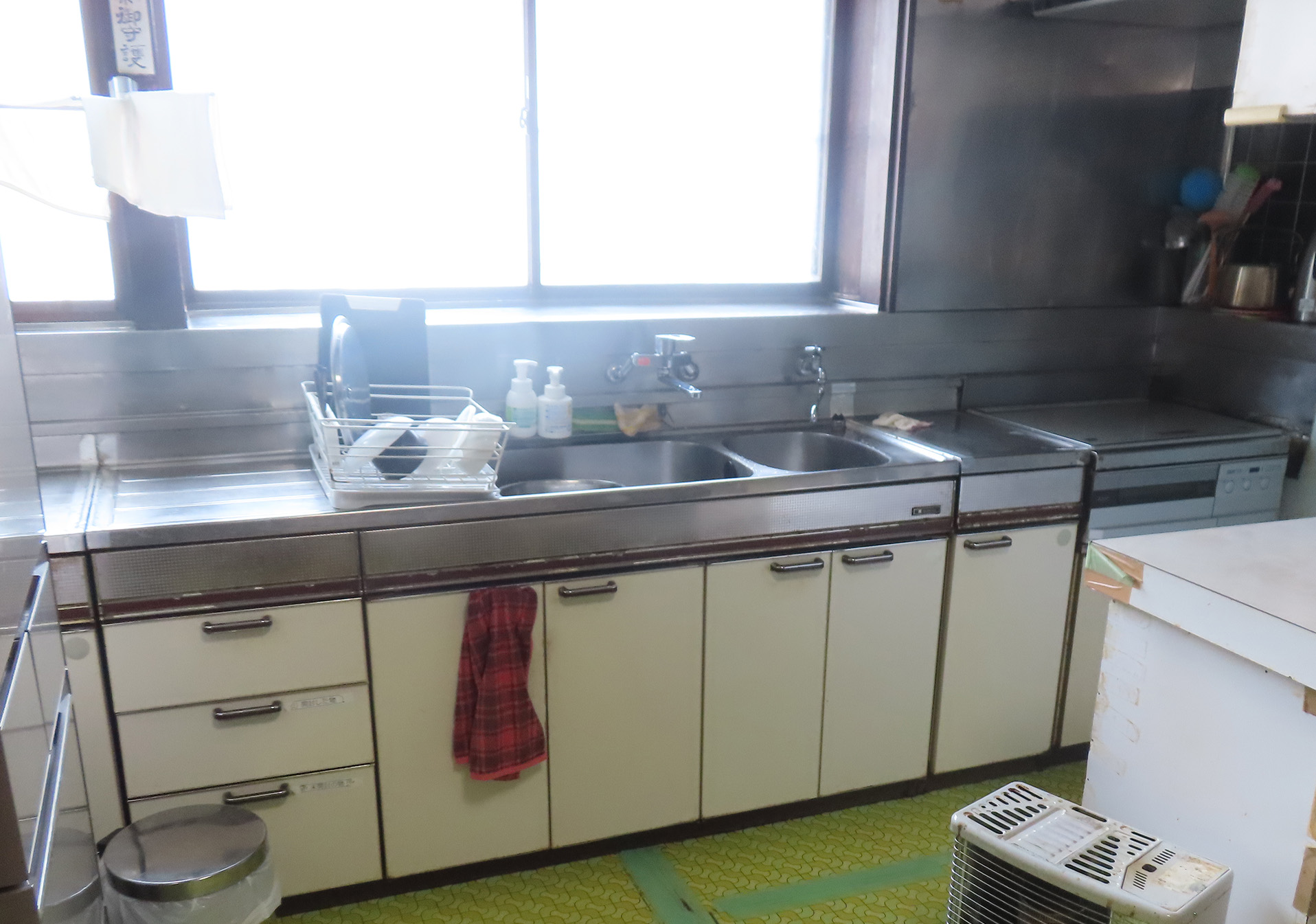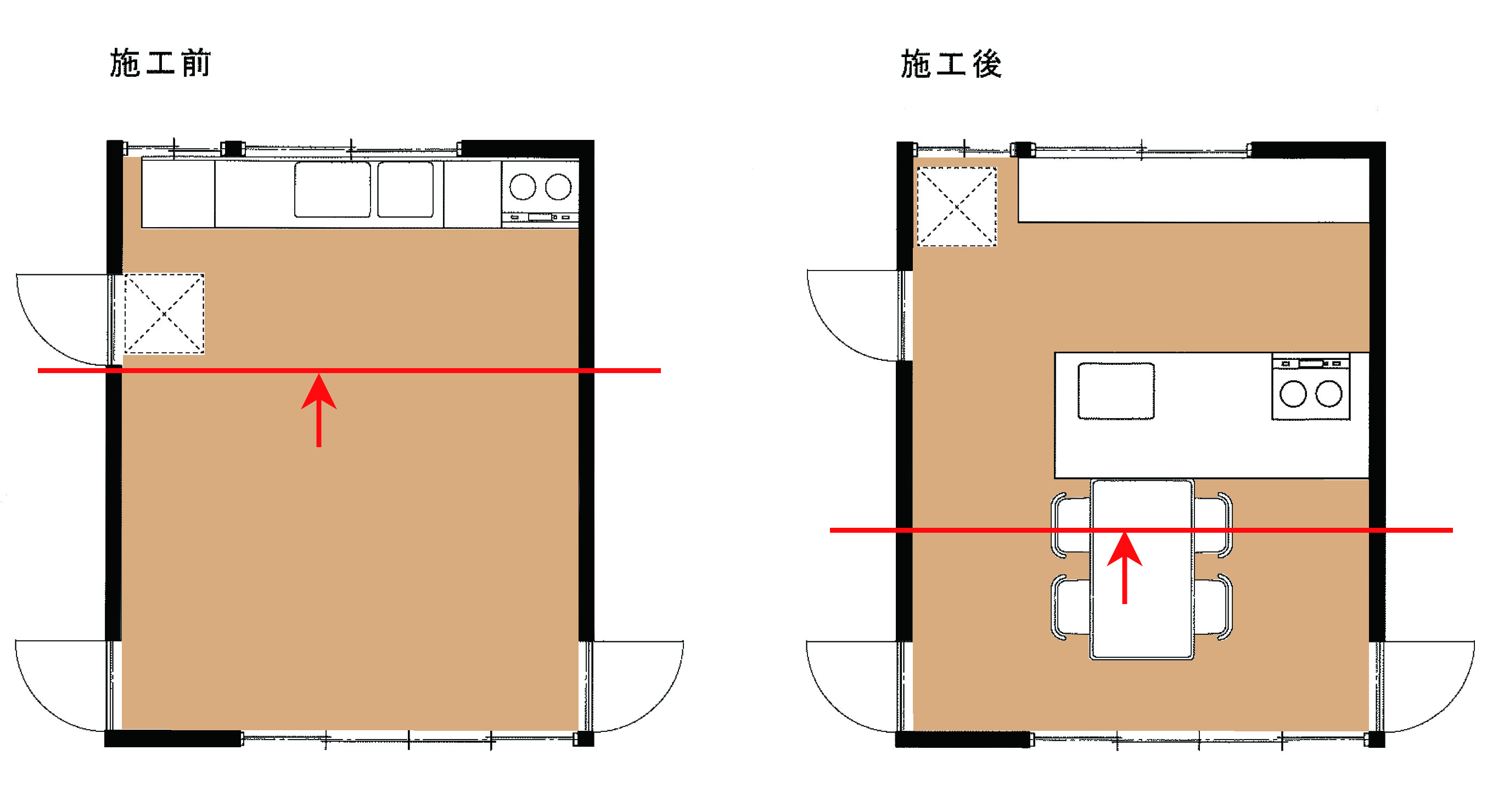 壁付けのI型キッチンを、部屋の中央の方へ移動しました。